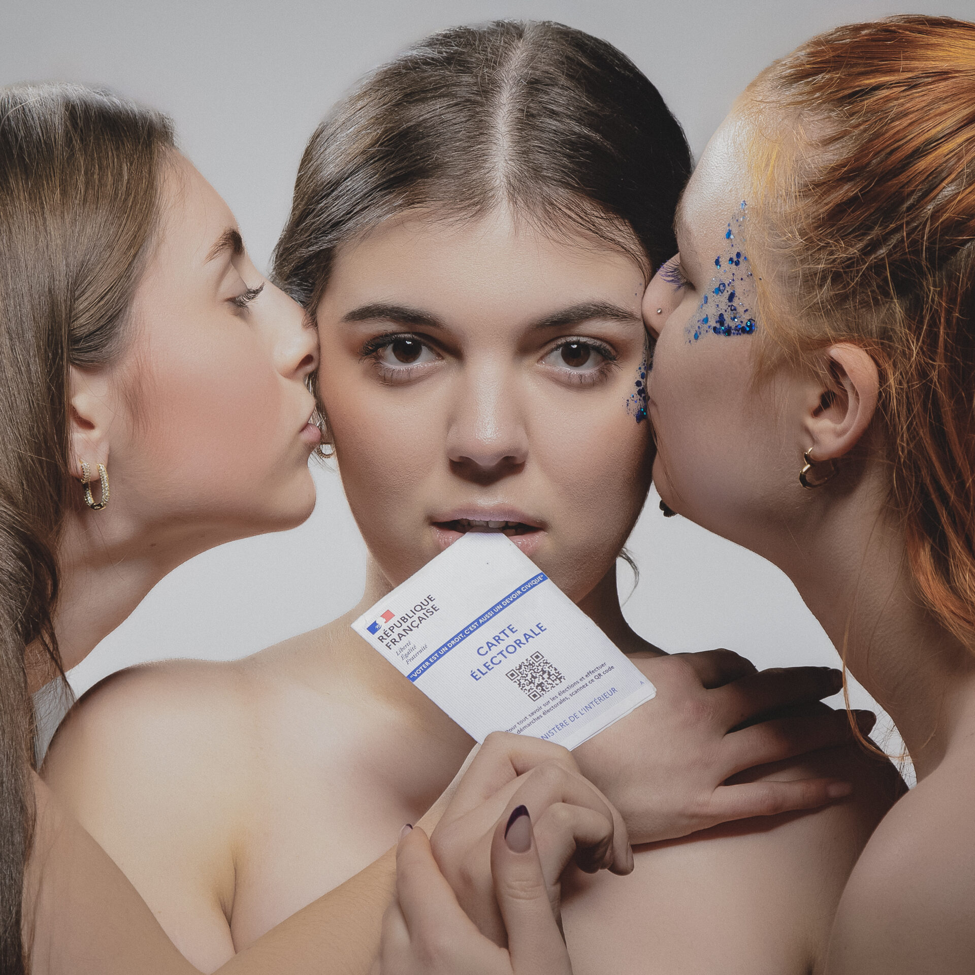 Liberté fait écho à la devise républicaine française Liberté, Égalité, Fraternité. En représentant le drapeau tricolore à travers les fonds colorés des portraits, cette première notion est solidifiée tout en rendant hommage aux diptyques Marilyn d’Andy Warhol. La présence de femmes aux épaules dénudées renforce les symboles français, rappelant « La Liberté guidant le peuple » d’Eugène Delacroix où Marianne porte le drapeau bleu, blanc et rouge, épaules et torse nus.